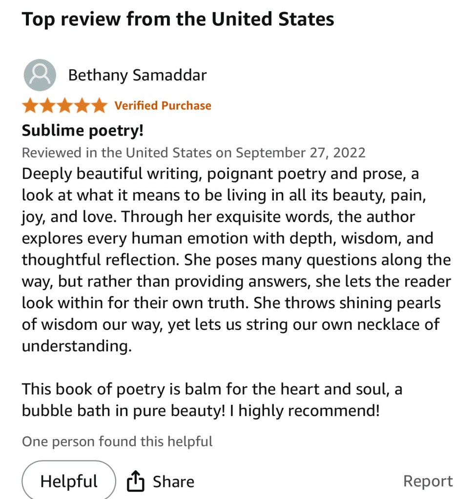 This text is a book of poems but it’s beyond that. It’s a voice, a journey to-and-fro in metamorphosis. This book is separated by stages of transformation: from love and heartbreak, to finding oneself, from exploring one’s depths transcendentally, to exploring, feeling, and finding the lost voice of others, and lastly, to create stories for and about others.