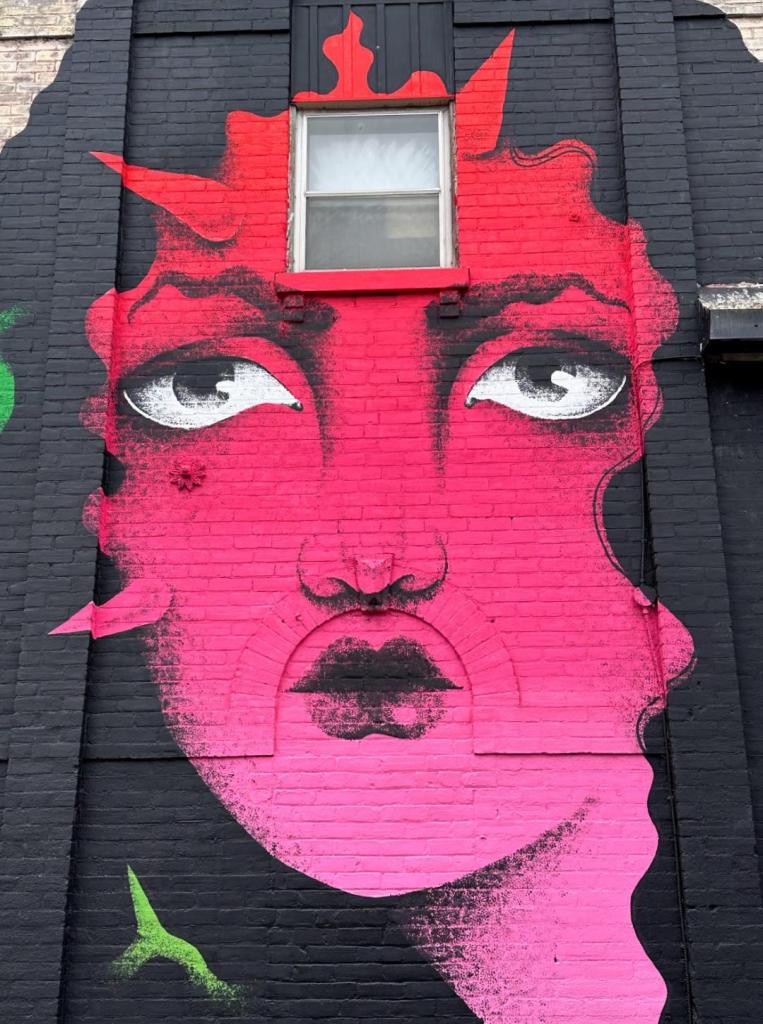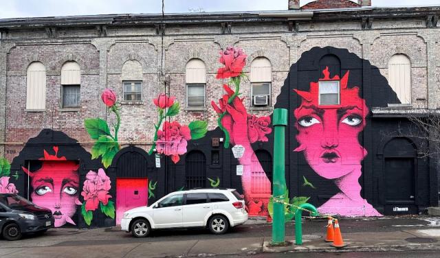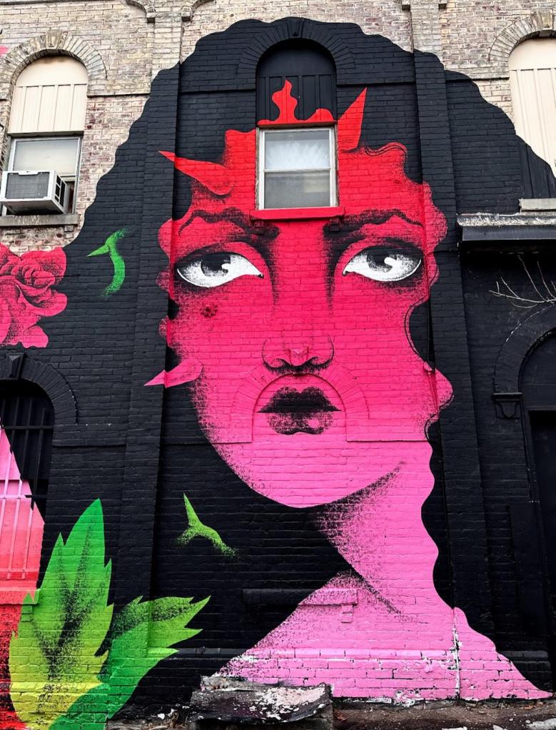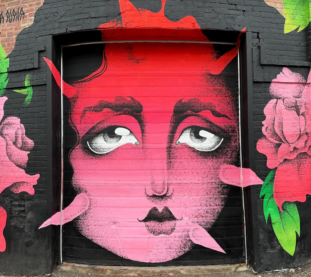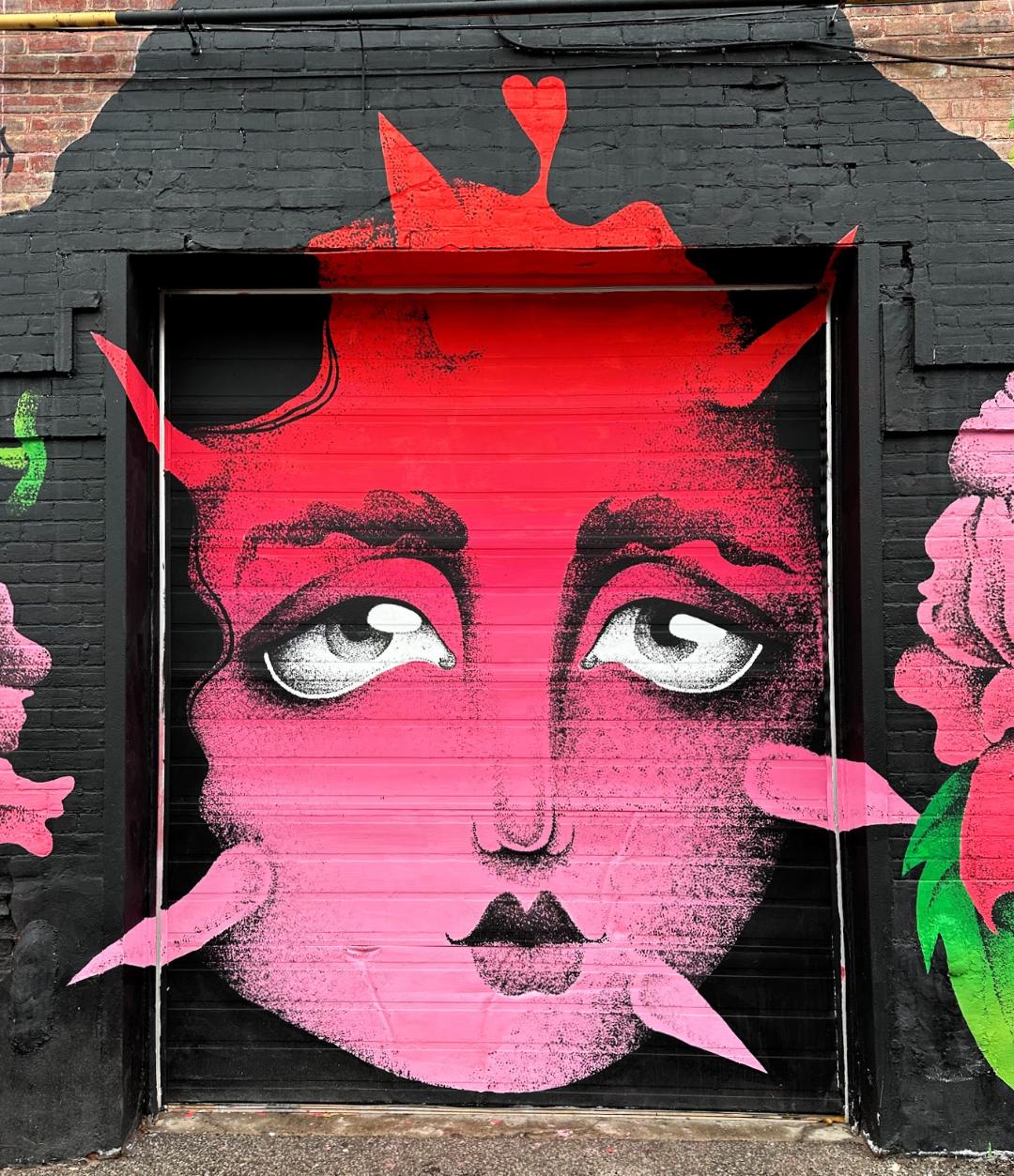 Picture caption: the full mural with two large female faces with horn-like protrusions and flowers that look like roses. The mural is largely black (the hair) and reddish pink (faces and flowers).