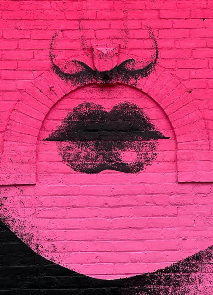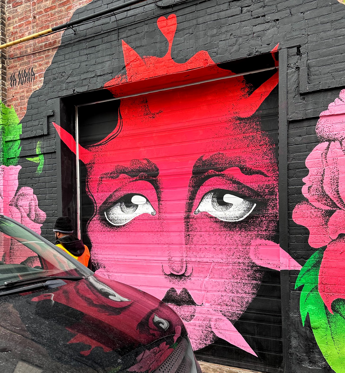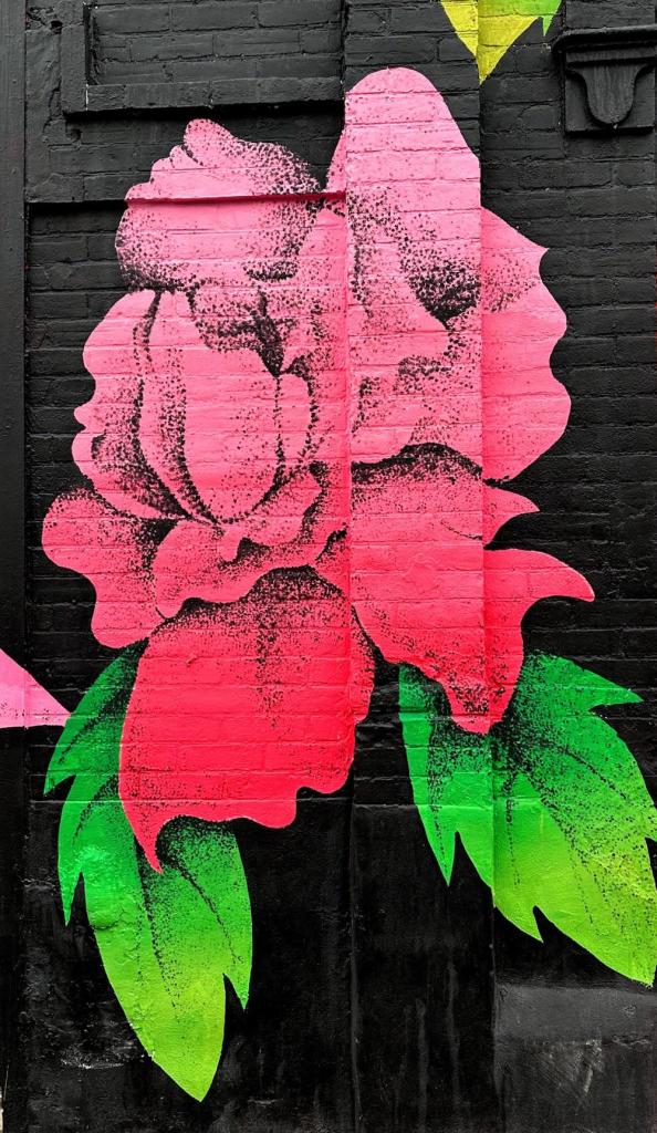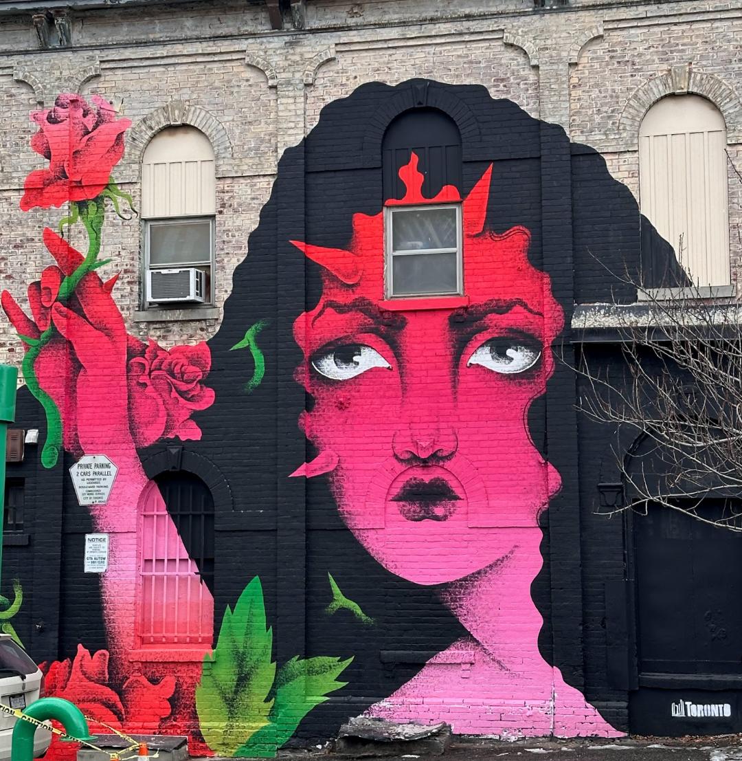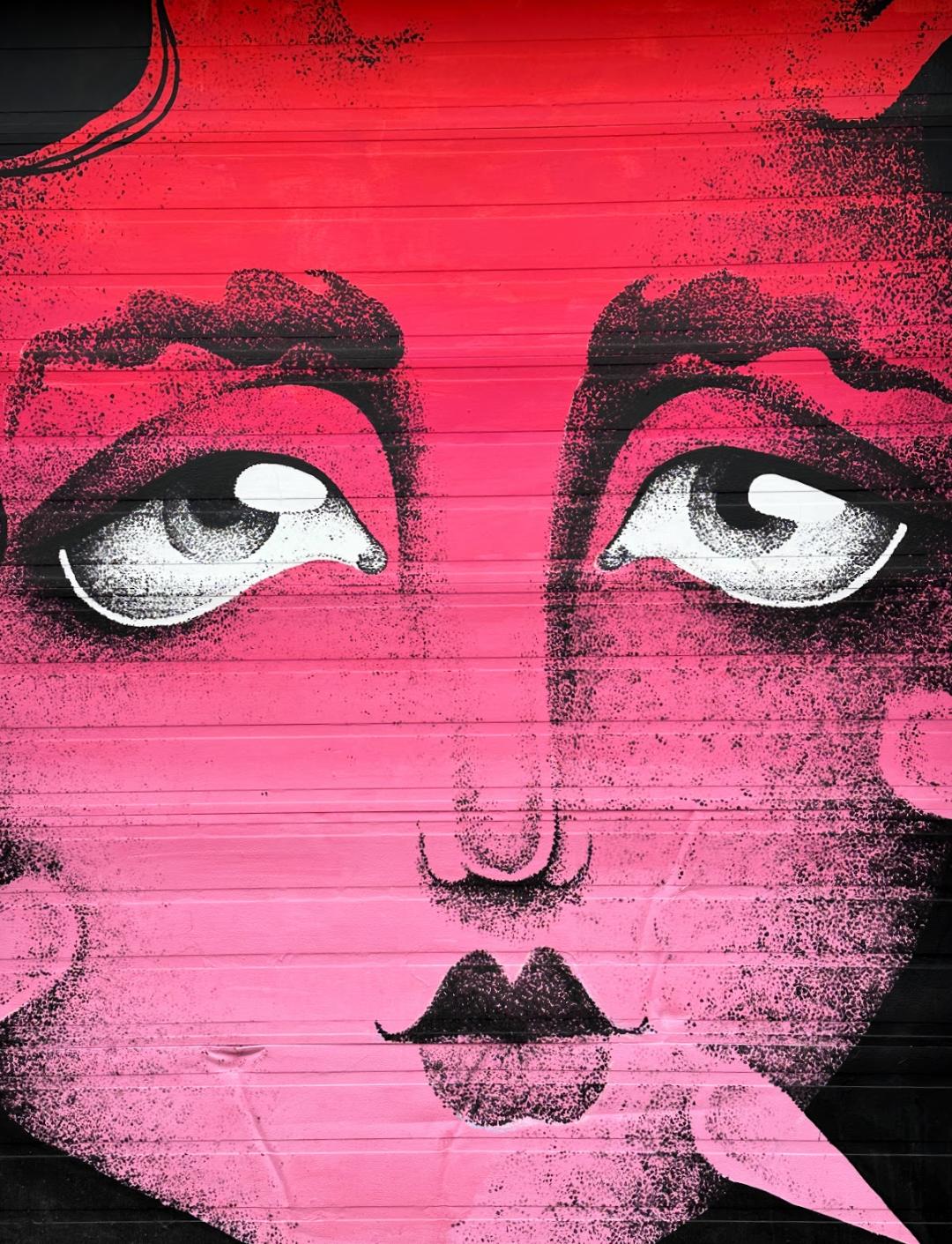 Picture caption: the full mural with two large female faces with horn-like protrusions and flowers that look like roses. The mural is largely black (the hair) and reddish pink (faces and flowers).