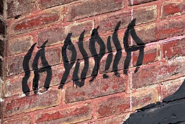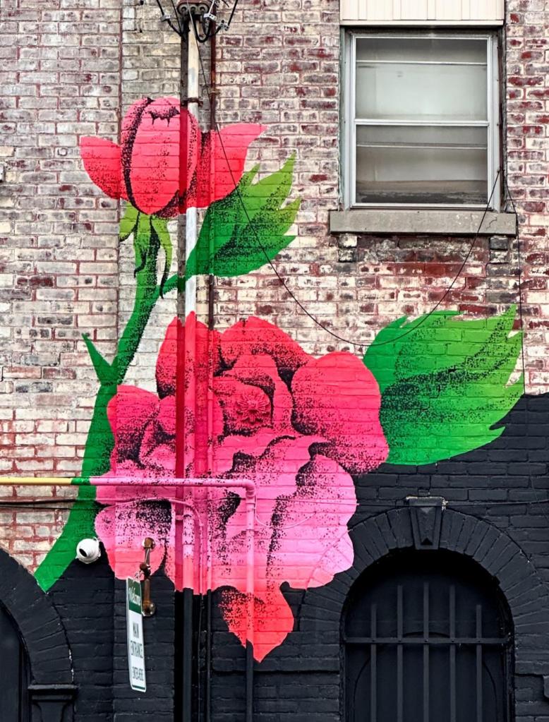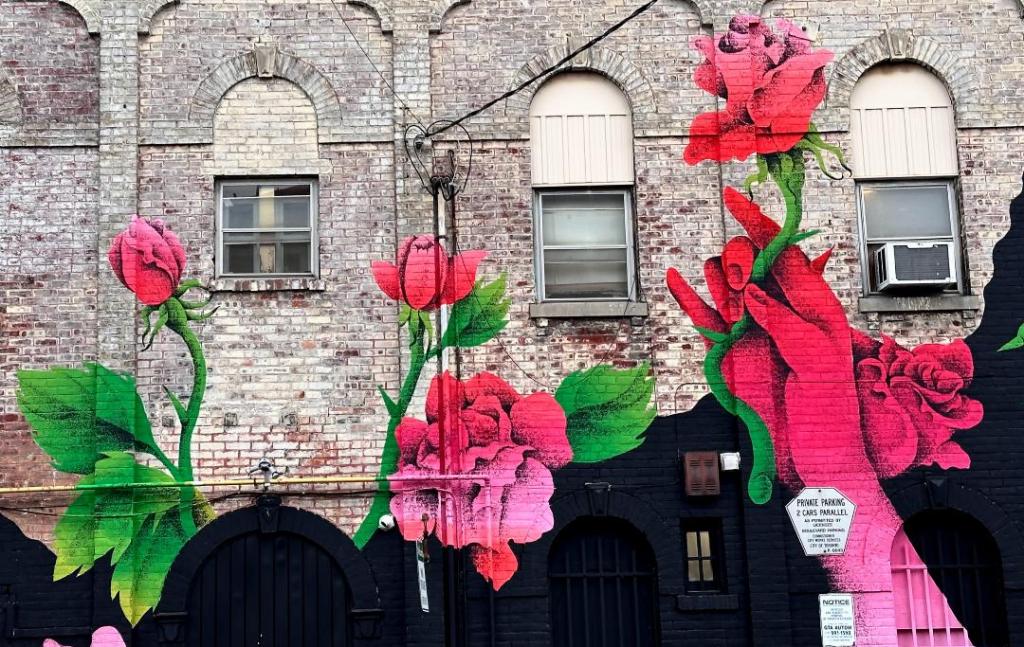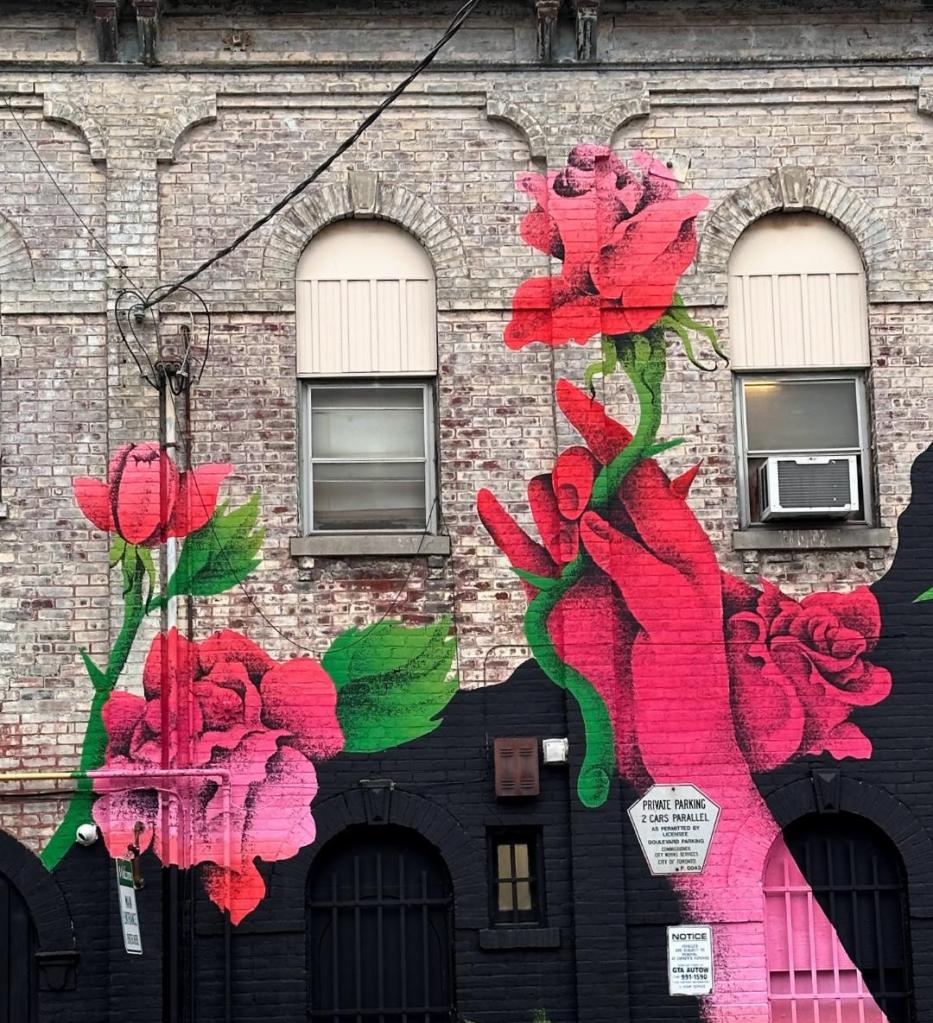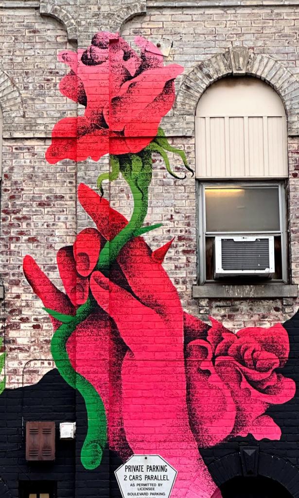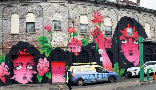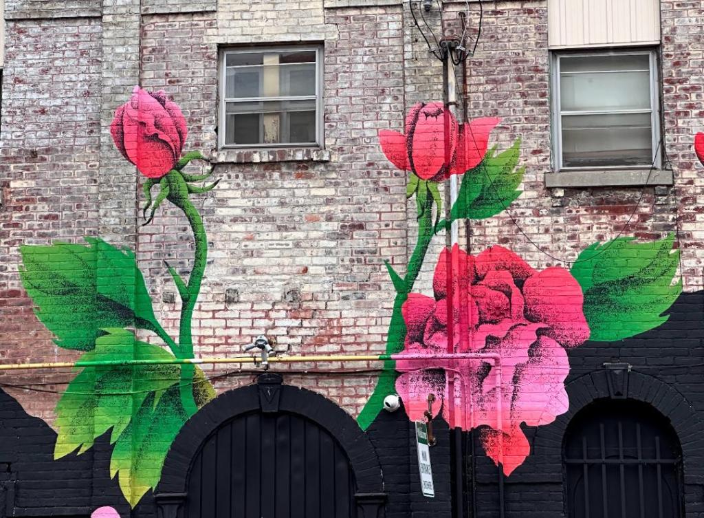 Picture caption: the full mural with two large female faces with horn-like protrusions and flowers that look like roses. The mural is largely black (the hair) and reddish pink (faces and flowers).
