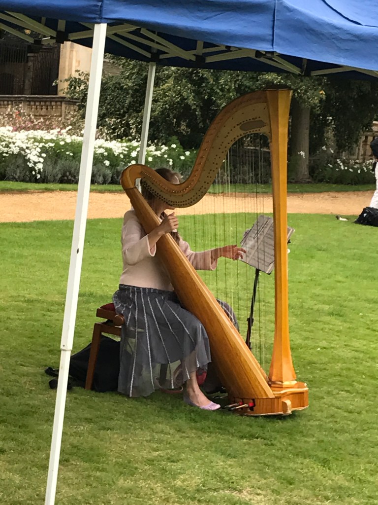 I took the following photograph at St John’s College at Cambridge University in the United Kingdom. The harpist is playing at a wedding. It really charmed me as I’d never seen a harp before. I’ve never seen one again.
