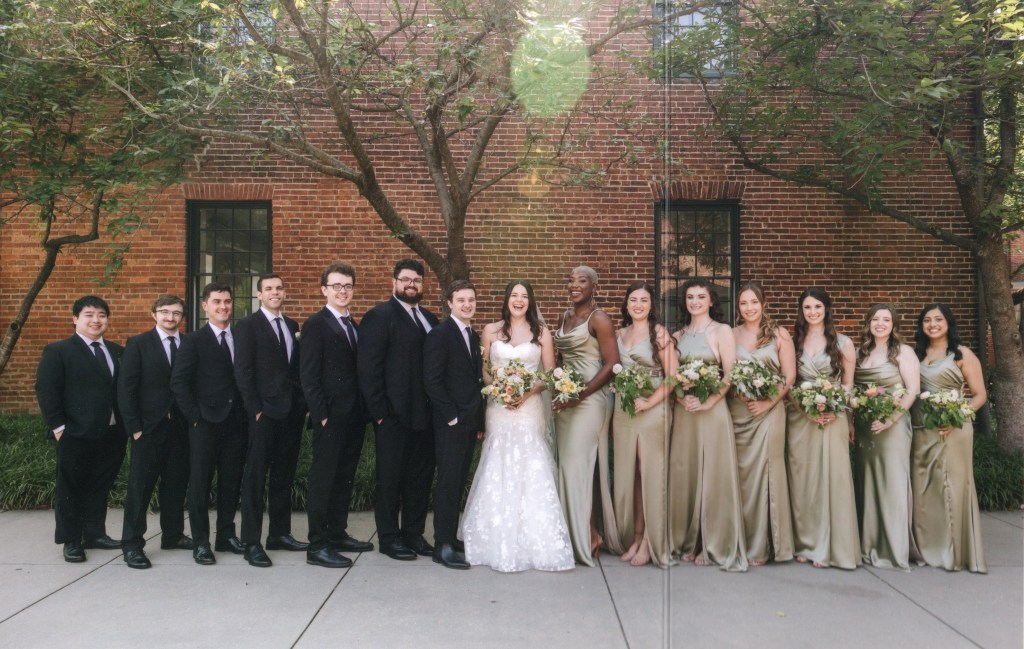 This photo is also from Jacob and Ashley’s wedding. It is the groom and bride in the middle. The groomsmen are on the left and bridesmaids are on the right. Jacob’s younger brother, David, is the second groomsman from Jacob. He was also the best man. The guy next to Jacob is Harrison. Both Harrison and David are tall guys. It is not everyone else who is short. Jacob’s sister Rachel is standing right in front of the window.