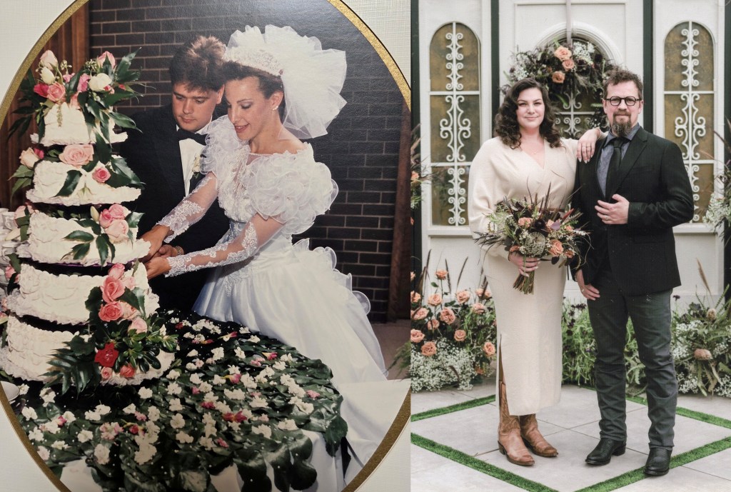 On the left is me and my wife Claudia cutting the wedding cake. This photo is taken July 28 1991 in Akron, Ohio. On the right is the wedding of our niece Jessica and her husband, Eric. This photo was taken March 30 2024.