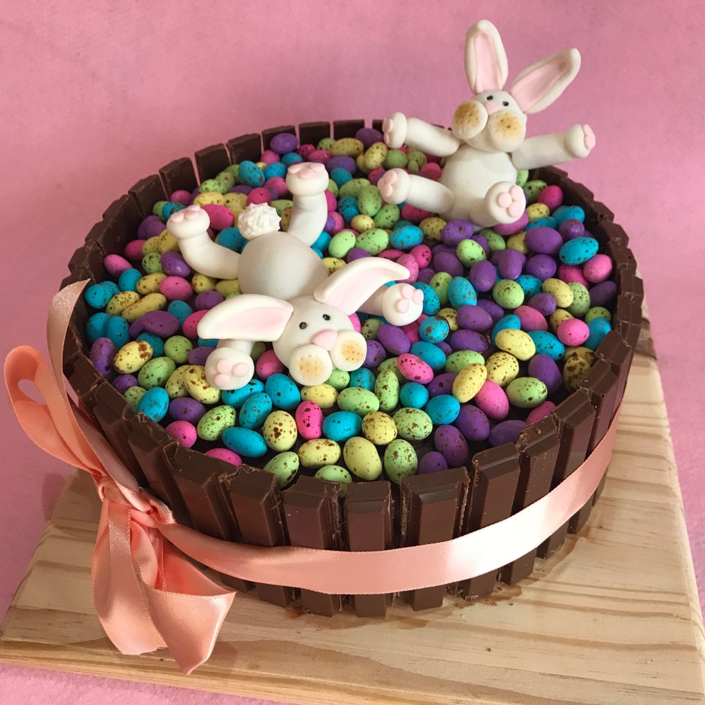 Picture caption: Easter cake featuring two Easter bunnies playing in a pond of small coloured Easter eggs. Cake creation by Robbie Cheadle.