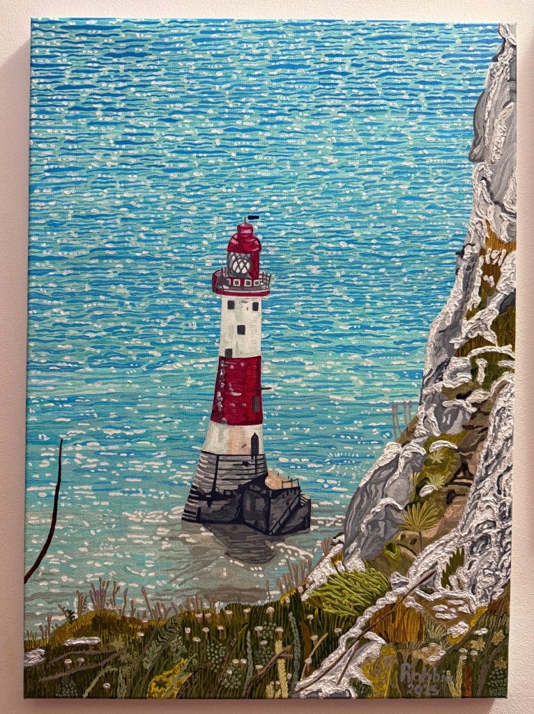 Following a trip to the UK in June last year, I decided to paint my mother a picture of the new lighthouse (relatively speaking) at Brighton. My mother worked in Brighton for a few years as a young woman. I created this painting from one of my own photographs and once again it was the water that a fascinated me the most. I was also intrigued by the white chalk cliffs and I experimented using acrylic texture paste to get more texture for my cliffs. I was happy with the result.
