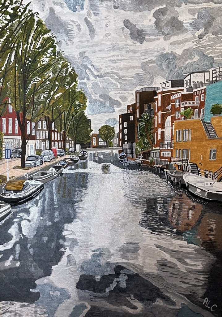 Two years ago, I decided I wanted to learn how to paint. I tried and my first painting was of a canal in Amsterdam. I painted this picture using one of my own photographs as a reference source. The reason I selected this picture to paint was because the water in the photograph completely fascinated me. I wanted to try and replicate the dark and compelling water using paint.
