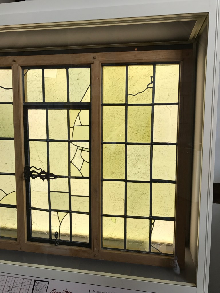 Picture caption: This is a window in Shakespeare’s birth house. It is signed (into the glass) by various authors including Charles Dickens