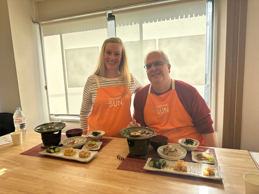 This is a picture of my husband and I in front of the 8-course Japanese meal we prepared at a cooking class in Tokyo.