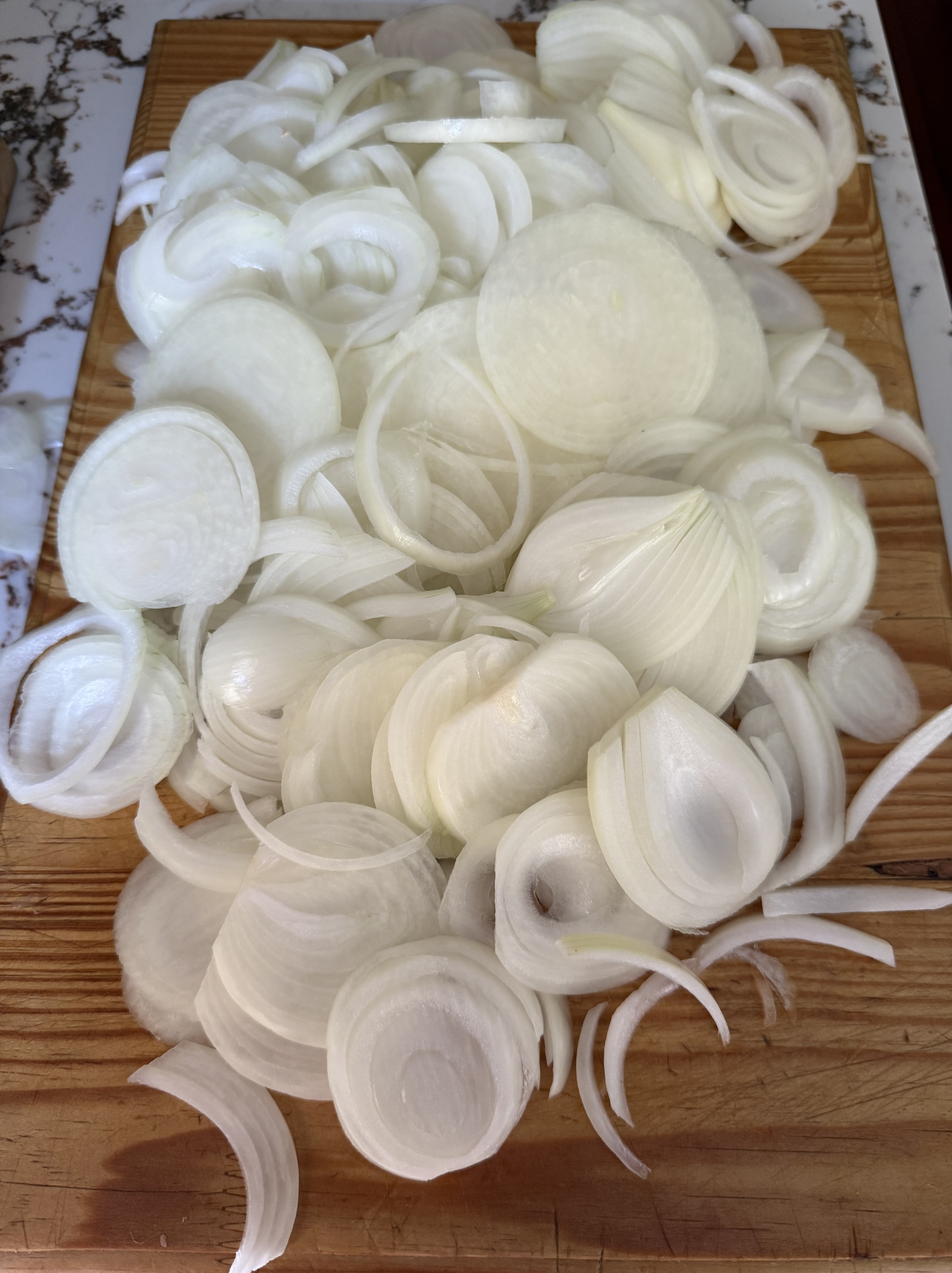 1.25 kg (8 large) onions sliced thinly from top to bottom