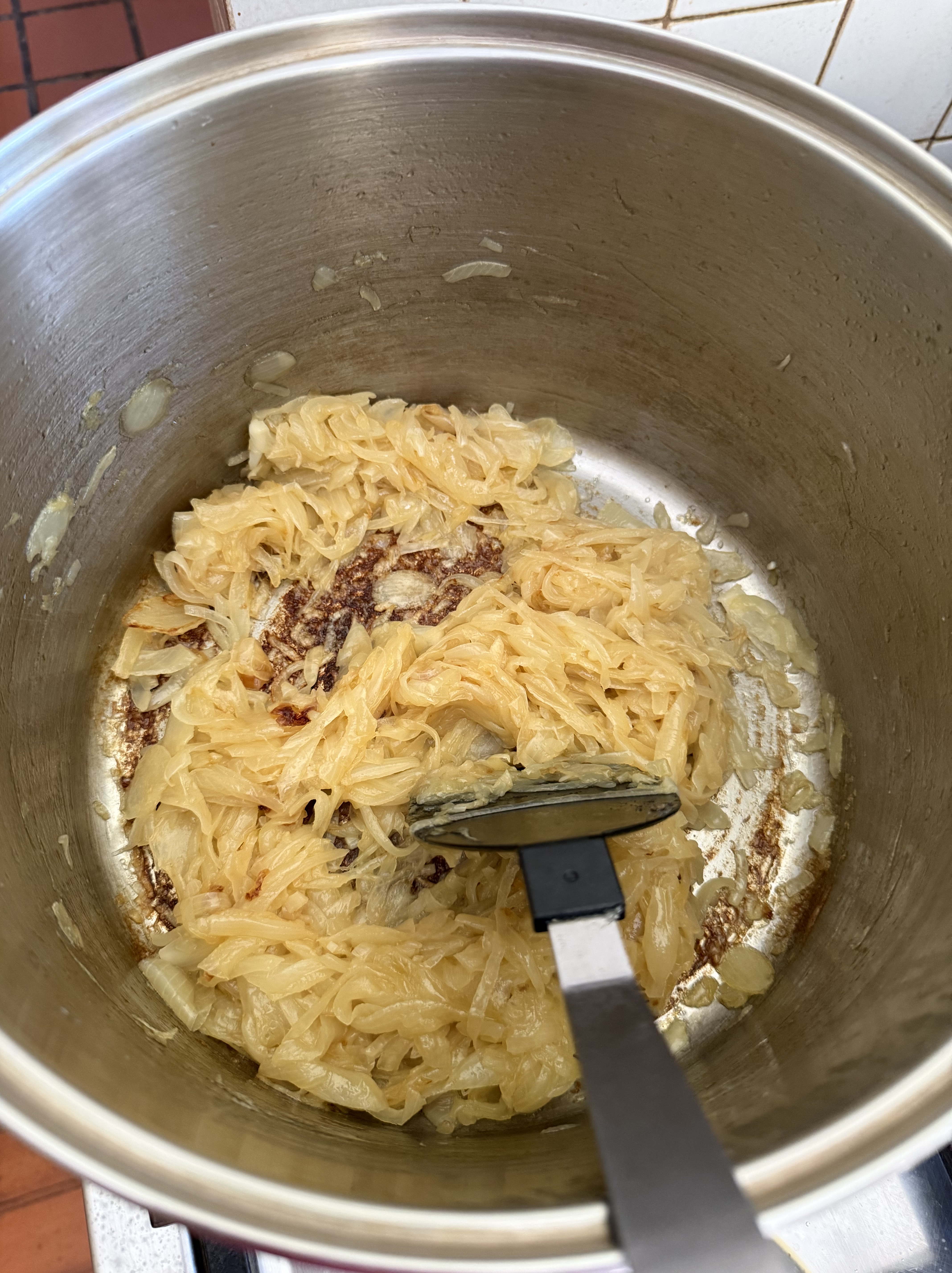 Melt the butter in a saucepan on a medium heat. When it starts to foam, add the sliced onions and stir until coated in butter. Cook the onions for 40 minutes, stirring often. Turn of the heat to high medium and cook for a further 20 minutes until golden brown. Keep stirring during this process so the onions don’t burn.