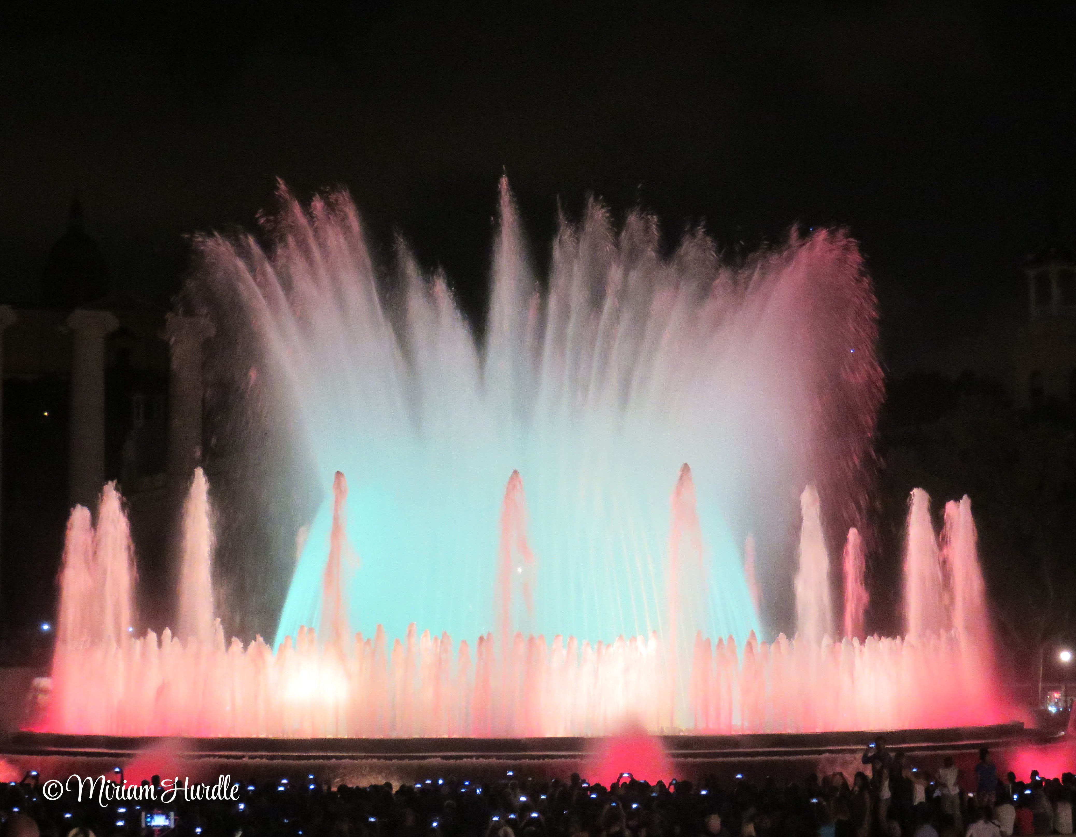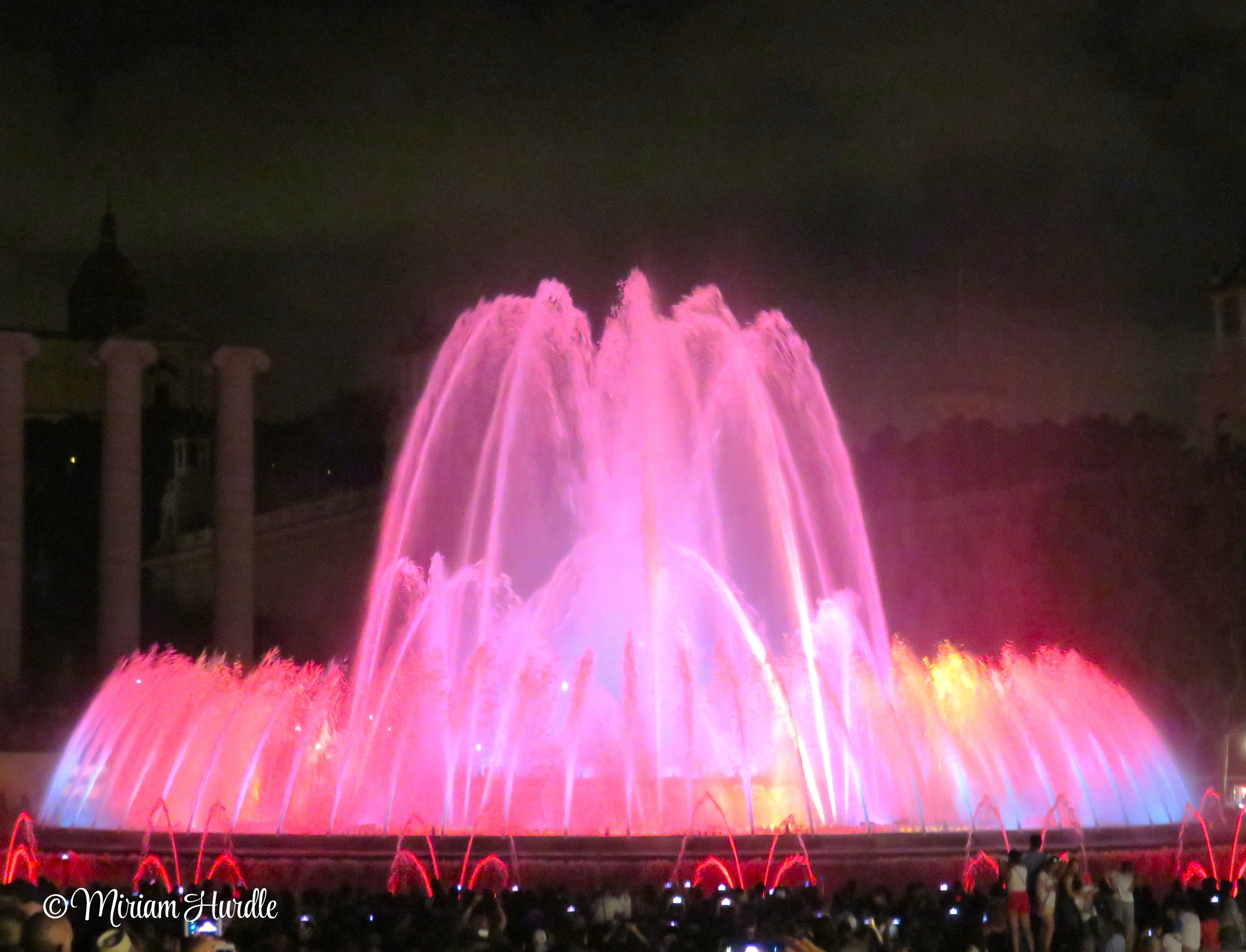 We were in Spain for our anniversary in August 2016. The photos are the water show of the Magic Fountain of Montjuïc in Barcelona. This attraction features a spectacular show combining music, colored lights, and choreographed water movement. It was originally designed by Carles Buïgas for the 1929 International Exposition. The fountain uses over 3,600 water jets and is equipped with modern LED lighting technology. Two people were leaving and gave me their spot to have a better view.